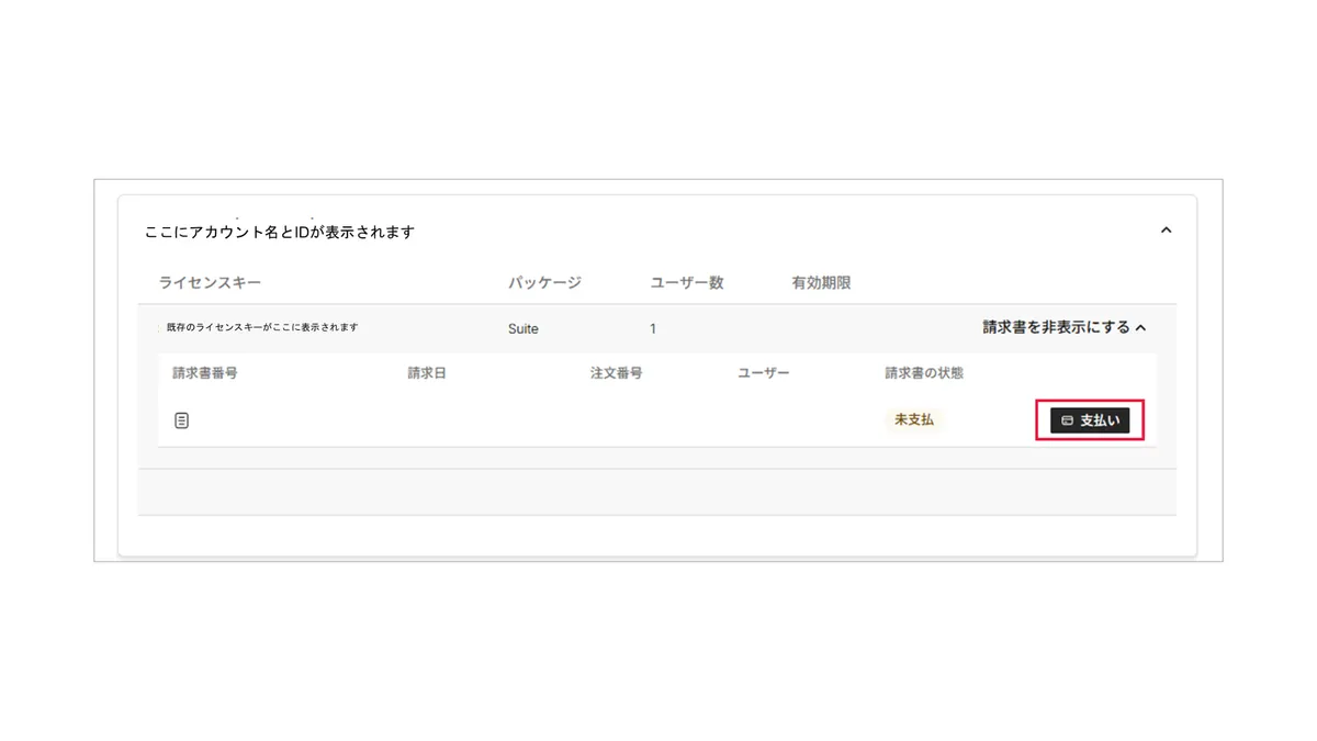 トップ > よくある質問 > 購入/更新について > 請求書払いをクレジットカード支払いに変更 運営事務局 2024/03/15 17:43 請求書払いをクレジットカード支払いに変更 Step1: こちらからポータルサイトへログインしてページ下部にある「ライセンスと請求書を表示する」を選択してください。 パスワードがわからない場合は下図赤枠にメールアドレスを入力してログインをお願いします。 メールアドレスのみでログインでき、パスワードはログイン後に設定できます。 Step2: 「請求書の状態」の下にある”💳支払い"のボタンをクリック Step3: クレジットカード情報を記入し、左下の”今すぐ払う”ボタンをクリックし、支払い完了です。 いいね 共有する 共有する X facebook LINE リンクをコピー コメントする 0 件の返信 (新着順)